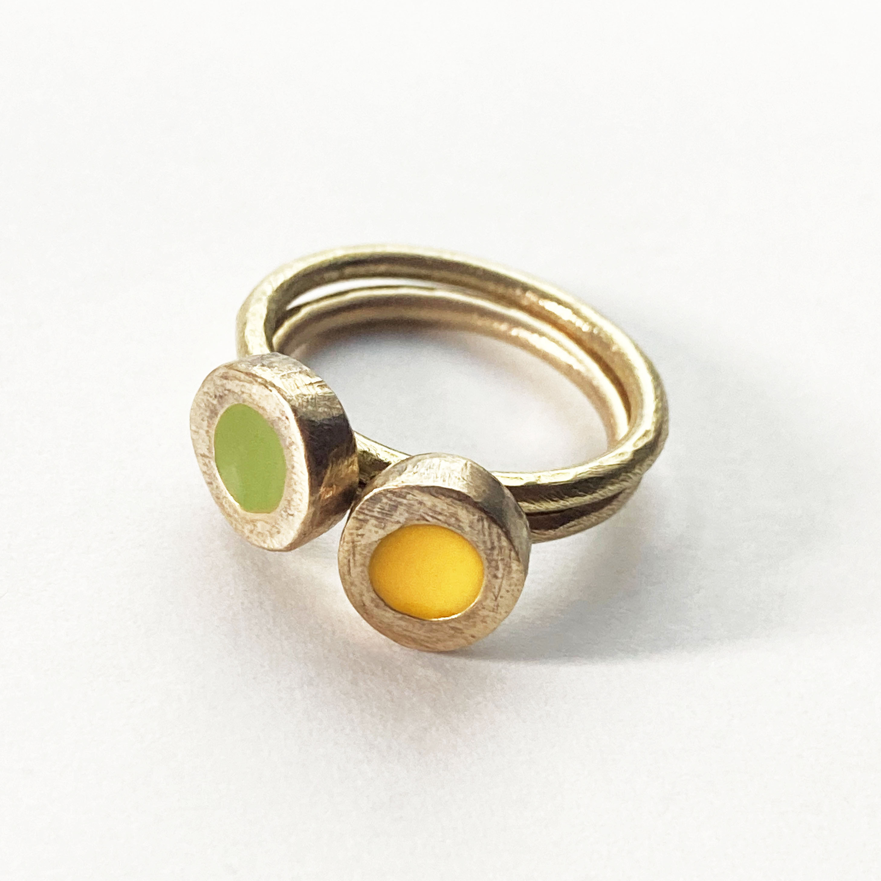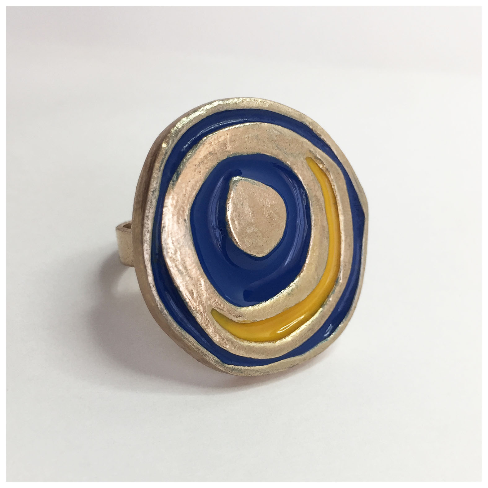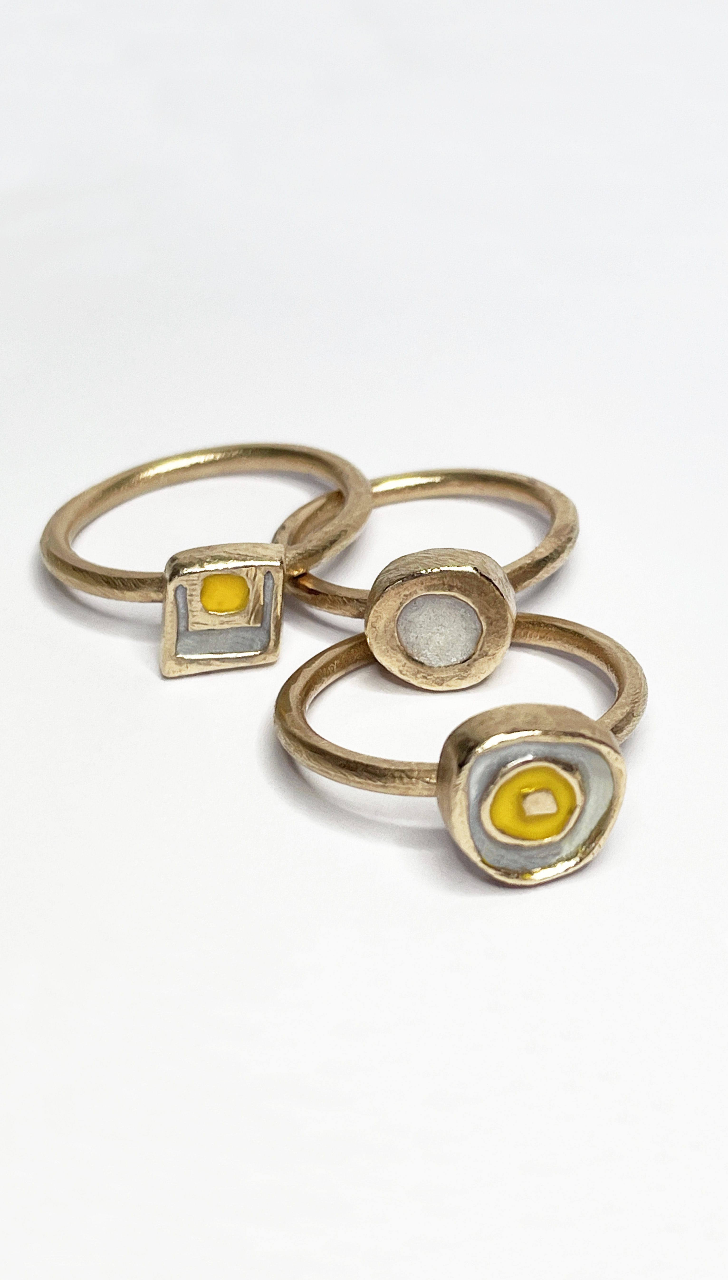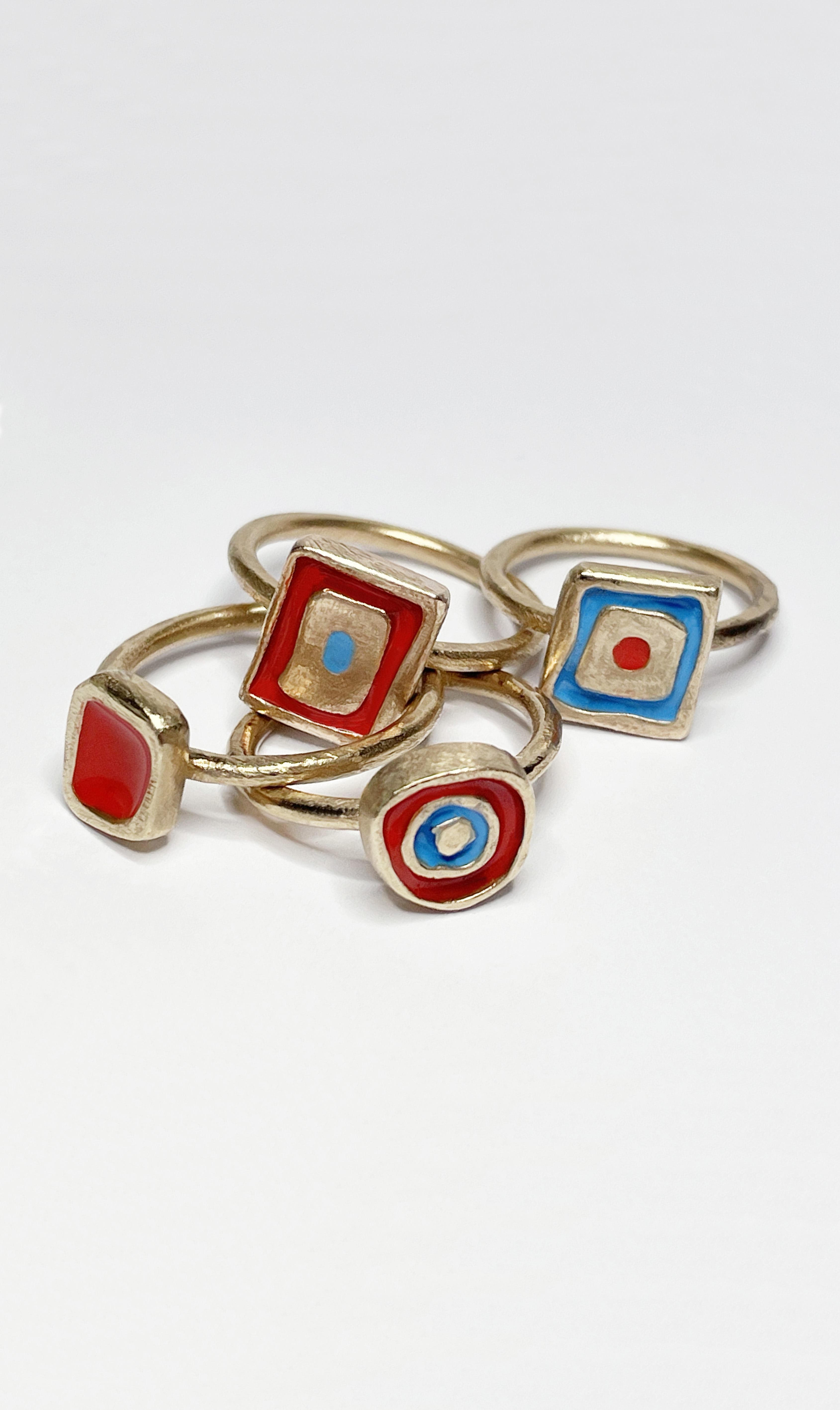 Cerchi concentrici e quadratini irregolari come provenienti da una geometria distorta, forse più in linea con l’universo e con il disegno a mano libera. Questa collezione è nata nel 2006 come progetto per la mia tesi di laurea, e poi si è ampliata, nel corso degli anni, di nuove diverse combinazioni colore.
