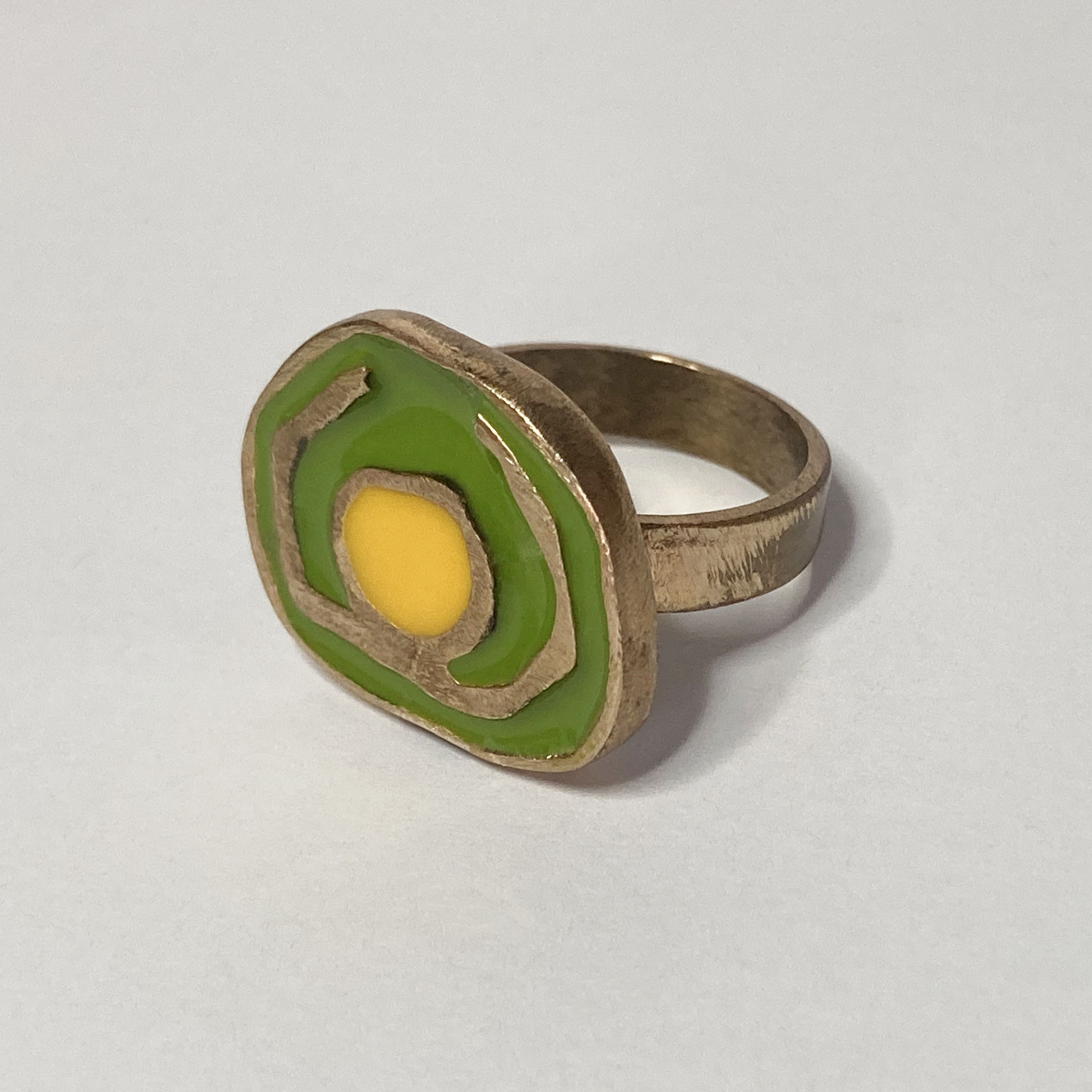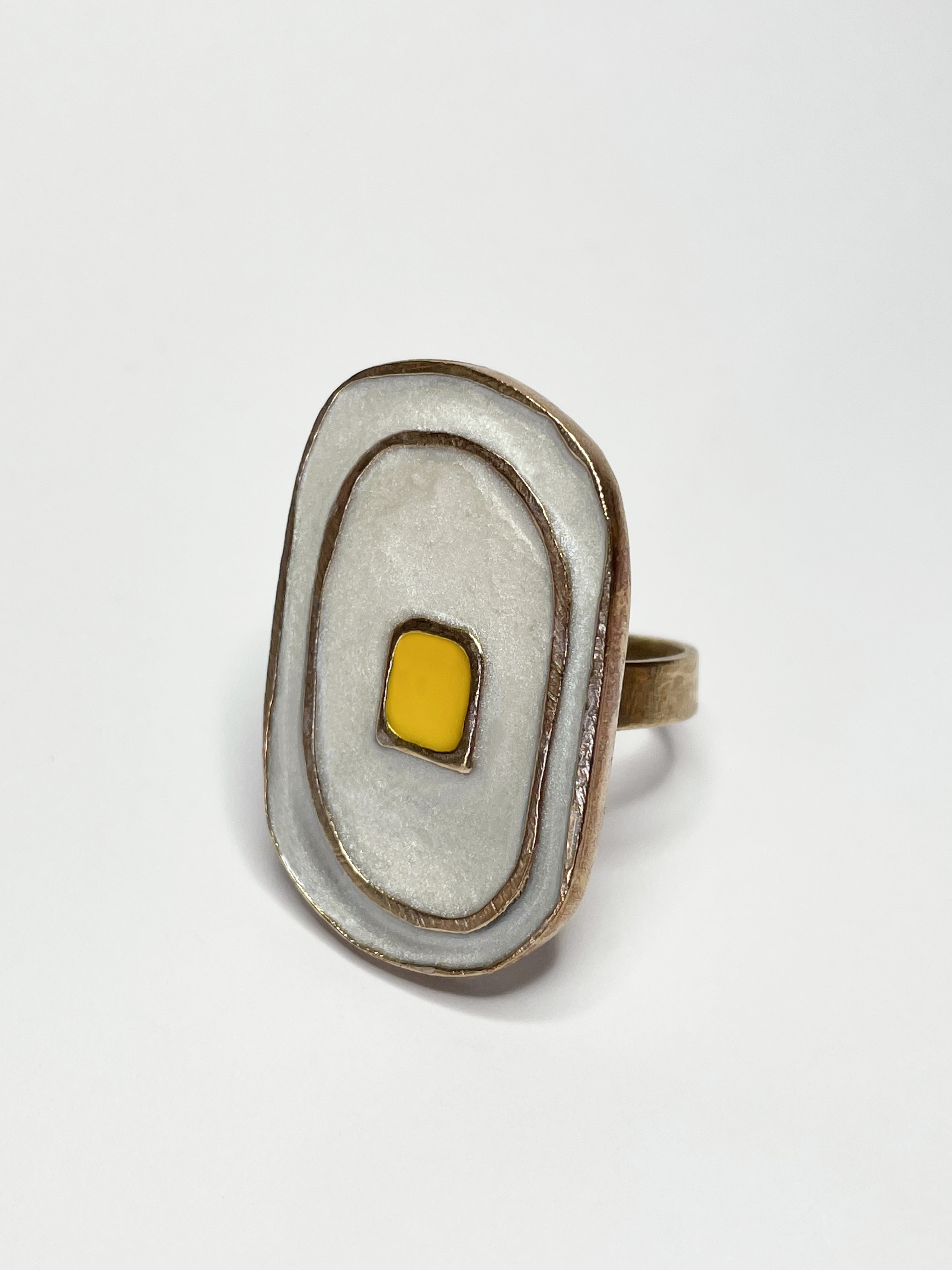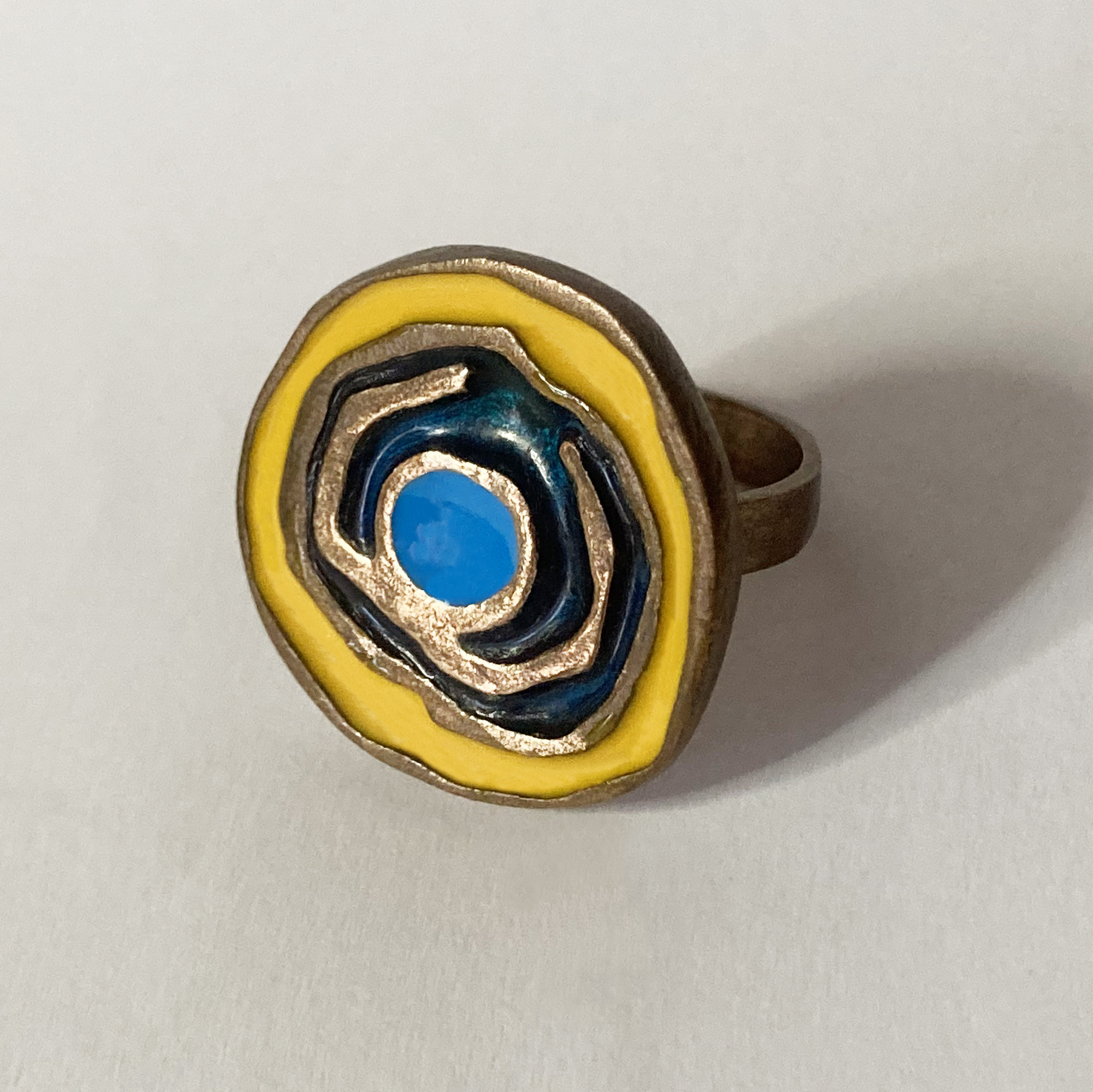 Cerchi concentrici e quadratini irregolari come provenienti da una geometria distorta, forse più in linea con l’universo e con il disegno a mano libera. Questa collezione è nata nel 2006 come progetto per la mia tesi di laurea, e poi si è ampliata, nel corso degli anni, di nuove diverse combinazioni colore.